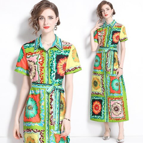 ロングワンピース 半袖 プリ...