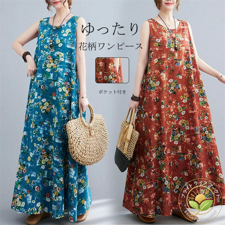 ロング 春夏 綿麻 花柄ワンピ...